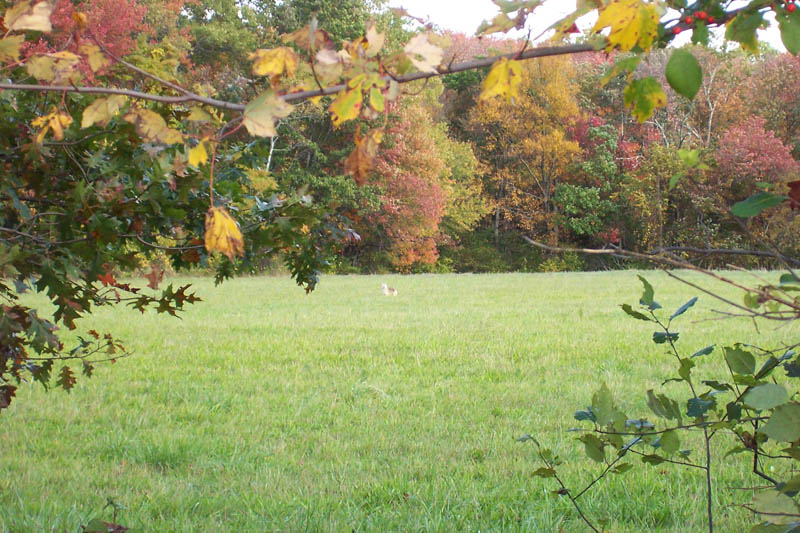 I like this photo, not only because of the branch hanging in front, and the trees in the background, but because of what looks to be like a deer in the grass.